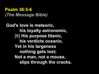 Psalm 36 The Message MSG A David Psalm 36 1-4 The God-rebel tunes in to sedition all ears eager to sin. 1-4 The God-rebel tunes in to sedition all ears eager to sin. Gods love is meteoric his loyalty astronomic His purpose titanic his verdicts oceanic.